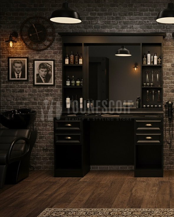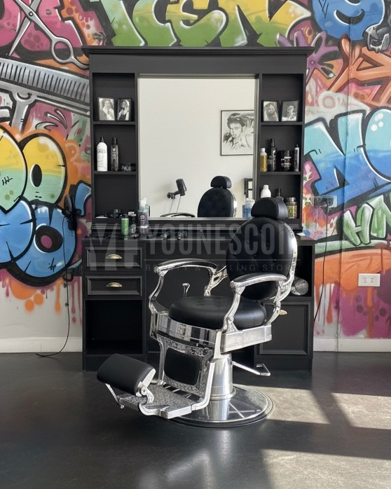 Ses finitions travaillées, son design robuste et son allure distinguée en font une pièce maîtresse pour tout salon de barbier recherchant authenticité et caractère.