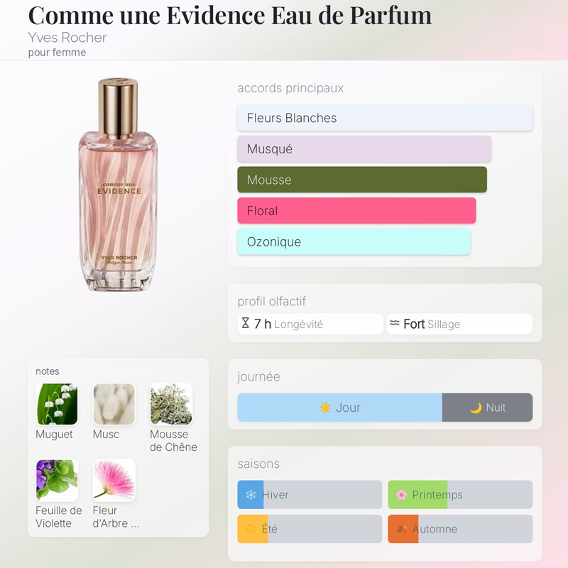 • Note de Cœur : Muguet – Un cœur floral pur, symbole d’élégance et de fraîcheur.