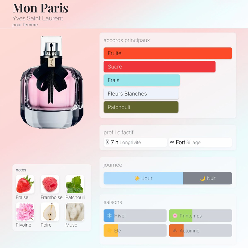 - Notes de tête : Fraise, Framboise, Poire, Orange, Bergamote de Calabre, Tangerine, Calone
